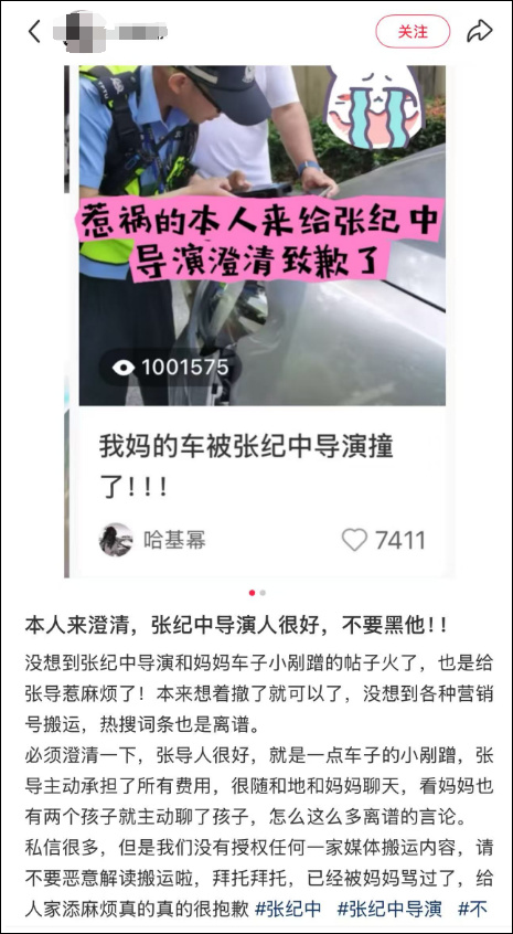 目前,网帖中提到的“爆料网友”已发帖澄清,称系张纪中与其母亲两车发生小刮蹭,张导主动承担所有费用,同时她也删去了此前的爆料帖。