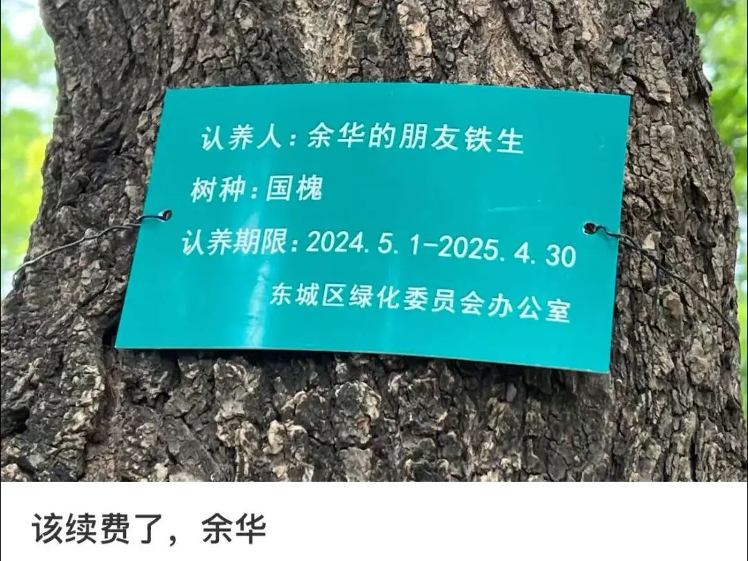 网友发帖显示,两棵国槐树树干上挂着两块牌子,分别写着“认养人:余华的朋友铁生”“认养人:铁生的朋友余华”,认养期限均是从2024年5月1日到2025年4月30日。