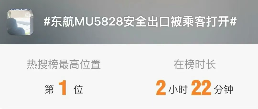 5月11日,长沙至昆明的东航MU5828航班上,一名乘客擅自打开安全出口引发关注,冲上社交平台热搜第一。