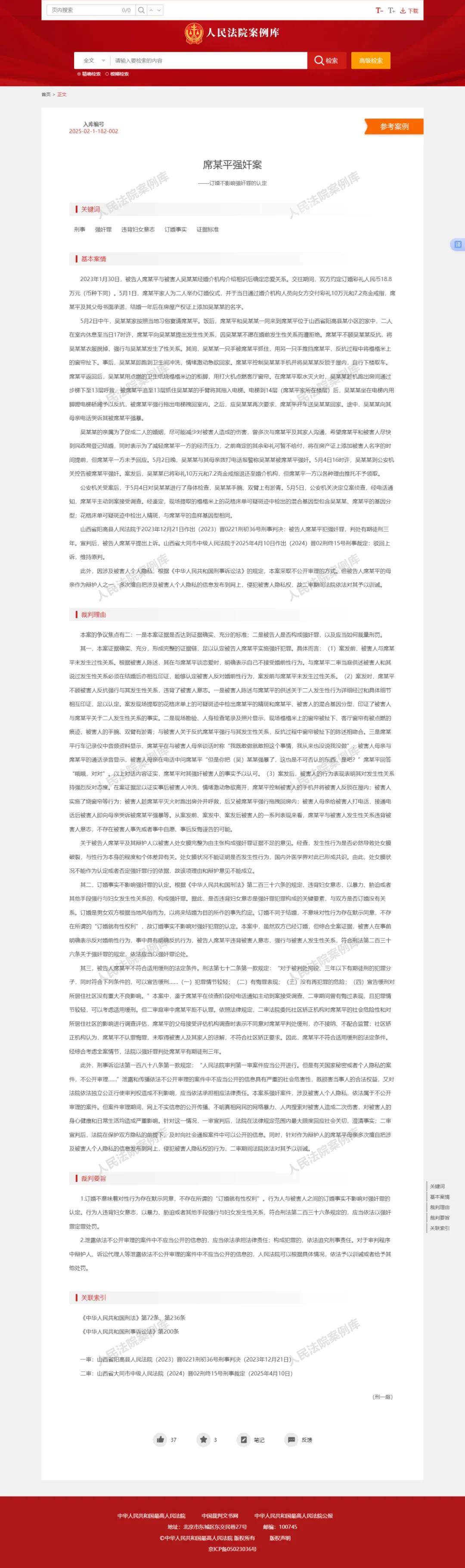 5月14日,根据人民法院案例库公开案例显示,山西大同“订婚强奸案”被列入最高人民法院发布的指导性案例或典型案例库。