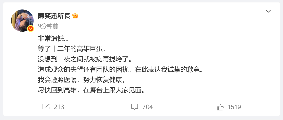 刚刚,陈奕迅本人微博也发文表示遗憾:等了十二年,一夜之间被病毒搅垮了……