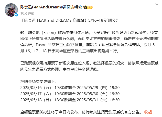 橙柿互动综合 5月15日,陈奕迅 Fear and Dreams 巡回演唱会官方微博发布延期公告: