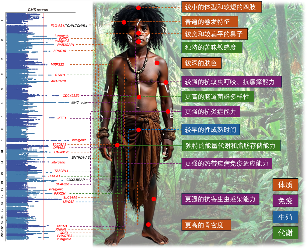 东南亚人群基因组中的自然选择信号和潜在的环境适应表型。(研究团队供图)