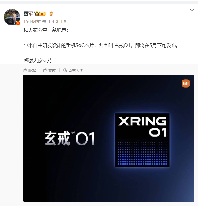 这是我们小米造芯10年阶段性的成果,也是小米突破硬核科技的新起点。造芯片是公众和米粉朋友们对我们殷切的期待,更是小米迈向硬核科技引领者的必由之路,我们小米将勇往直前。