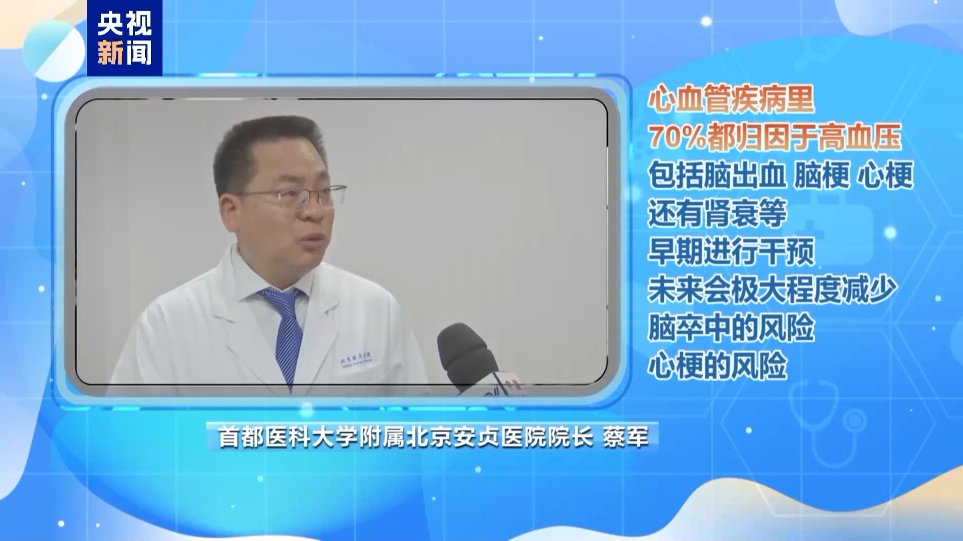 首都医科大学附属北京安贞医院院长 蔡军:有些老百姓的误区,老年人血压高一点很正常,能吃又能喝又能玩,血压高不管它,不影响生活。但是,我们知道高血压是隐匿性的,它逐步地损害身体。心血管疾病里面70%都归因于高血压,包括脑出血、脑梗、心梗,还有肾衰等等。如果早期进行干预,未来会极大程度减少脑卒中的风险、心梗的风险。