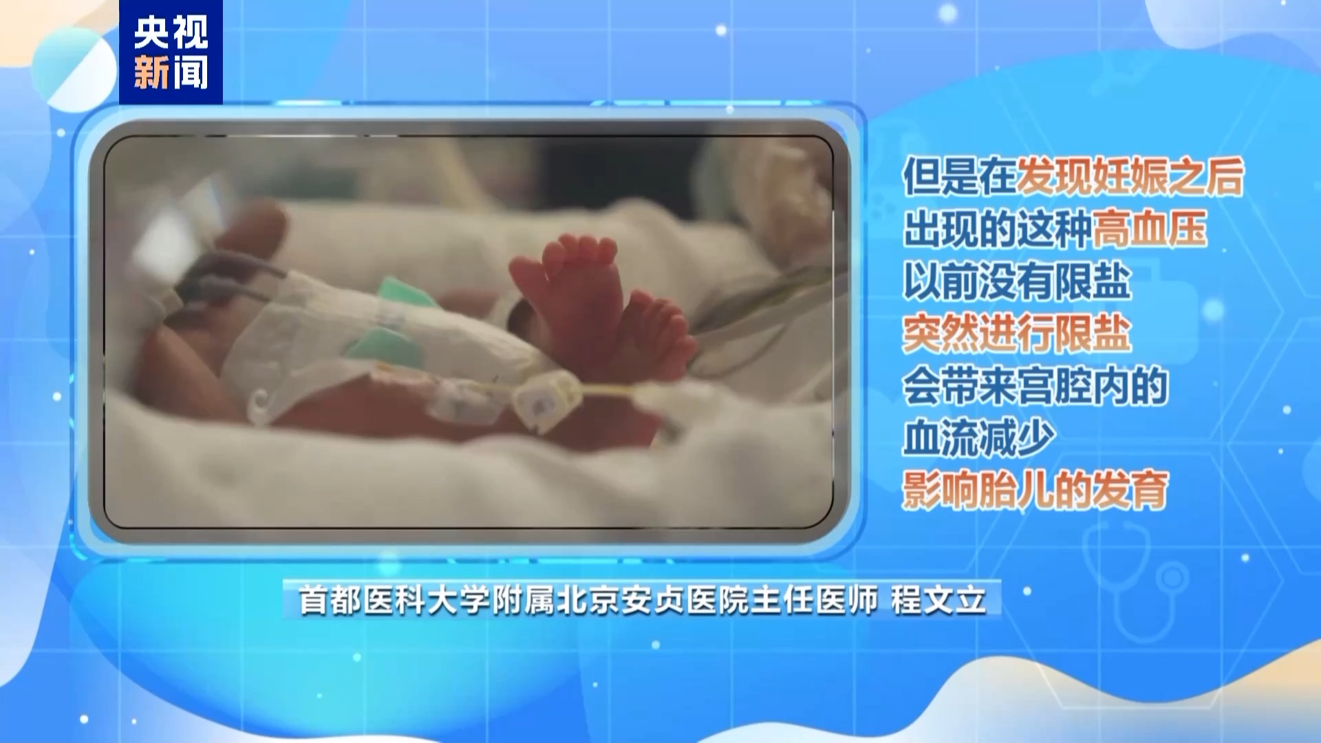 程文立:在妊娠前开始限盐,妊娠之后,延续妊娠前的食盐量的话,对胎儿影响不大。但是,如果在发现妊娠之后出现高血压,突然进行限盐的话,会带来我们宫腔内的血流减少,影响胎儿的发育。