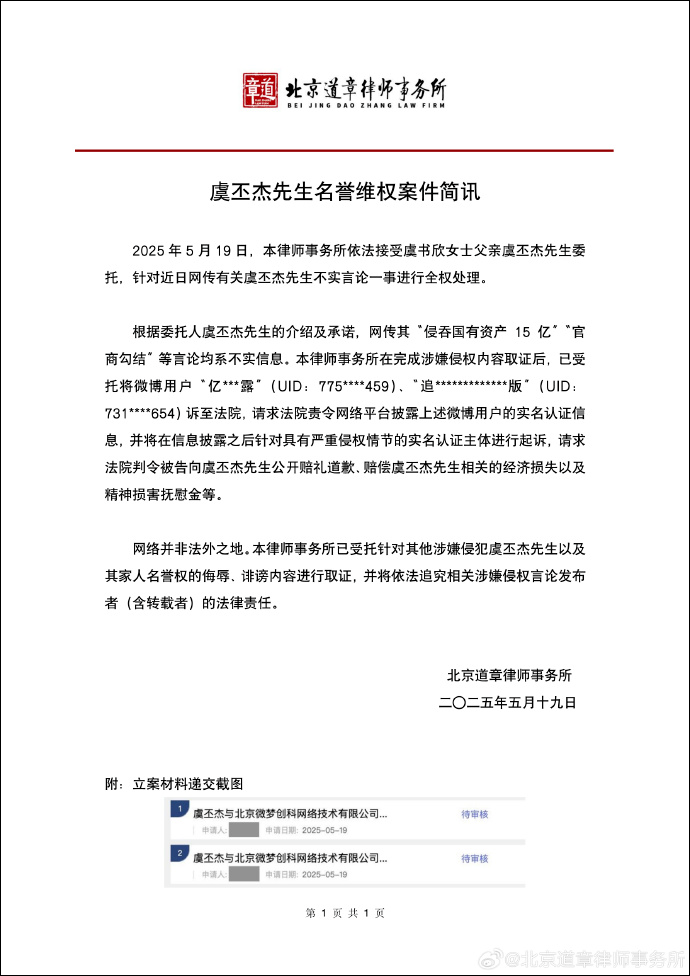 5月19日,北京道章律师事务所晒出名誉维权案件声明,称依法接受女星虞书欣爸爸虞丕杰先生委托,对网传其“侵吞国有资产15亿元”“官商勾结”等不实言论进行维权取证,将起诉具有严重侵权行为的实名认证主体。