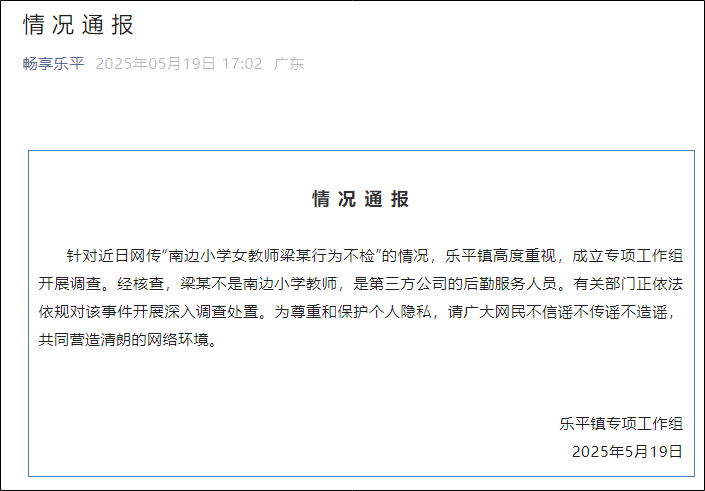 5月19日,广东省佛山市乐平镇专项工作组发布情况通报称,针对近日网传“南边小学女教师梁某行为不检”的情况,乐平镇高度重视,成立专项工作组开展调查。经核查,梁某不是南边小学教师,是第三方公司的后勤服务人员。有关部门正依法依规对该事件开展深入调查处置。为尊重和保护个人隐私,请广大网民不信谣不传谣不造谣,共同营造清朗的网络环境。