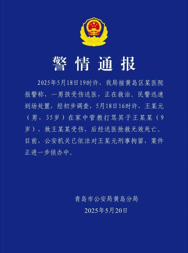 20日晚,青岛市公安局黄岛分局发布通报称,2025年5月18日19时许,接黄岛区某医院报警称,一男孩受伤送医,正在救治。民警到场处置,经初步调查,5月18日16时许,王某元(男,35岁)在家中管教打骂其子王某某(9岁),致王某某受伤,后经送医抢救无效死亡。目前,公安机关已依法对王某元刑事拘留,案件正进一步侦办中。