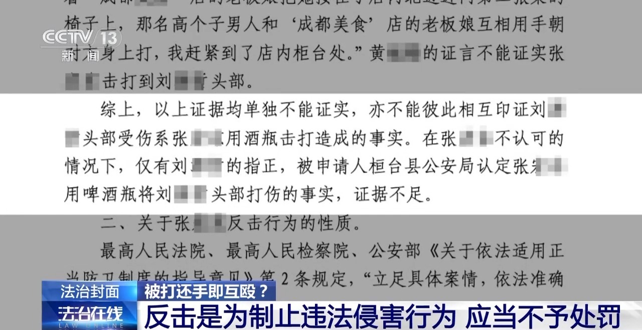 淄博市人民检察院第五检察部主任 杨刚:我们不能用事后的眼光去判断,我们要站在一个普通人的角度去看这个案件,我代入张女士,我处在那个位置上,我能怎么办?对方来我的饭店寻衅滋事闹事,我难道就任他欺负,任他打骂,我难道一直要等到公安机关过来,在这个过程当中我什么都不能做吗?我觉得这个是跟我们现代的法治理念相悖的。