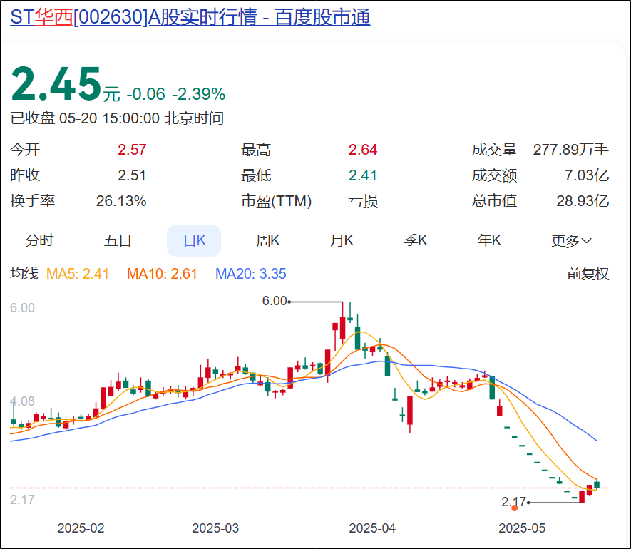 值得一提的是,上午11时10分,ST华西股价出现波动,公司涨停板被“砸开”,当日收盘收跌2.39%。而ST华西披露收到黎仁超书面辞职报告的时间是11时46分。而在近一个月内,ST华西股价已暴跌超40%。