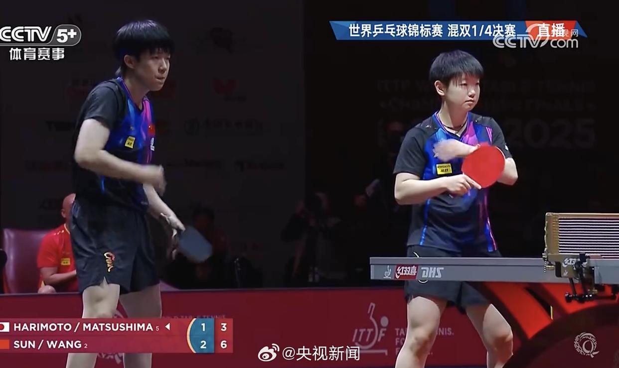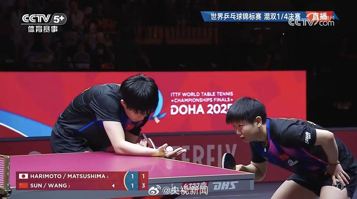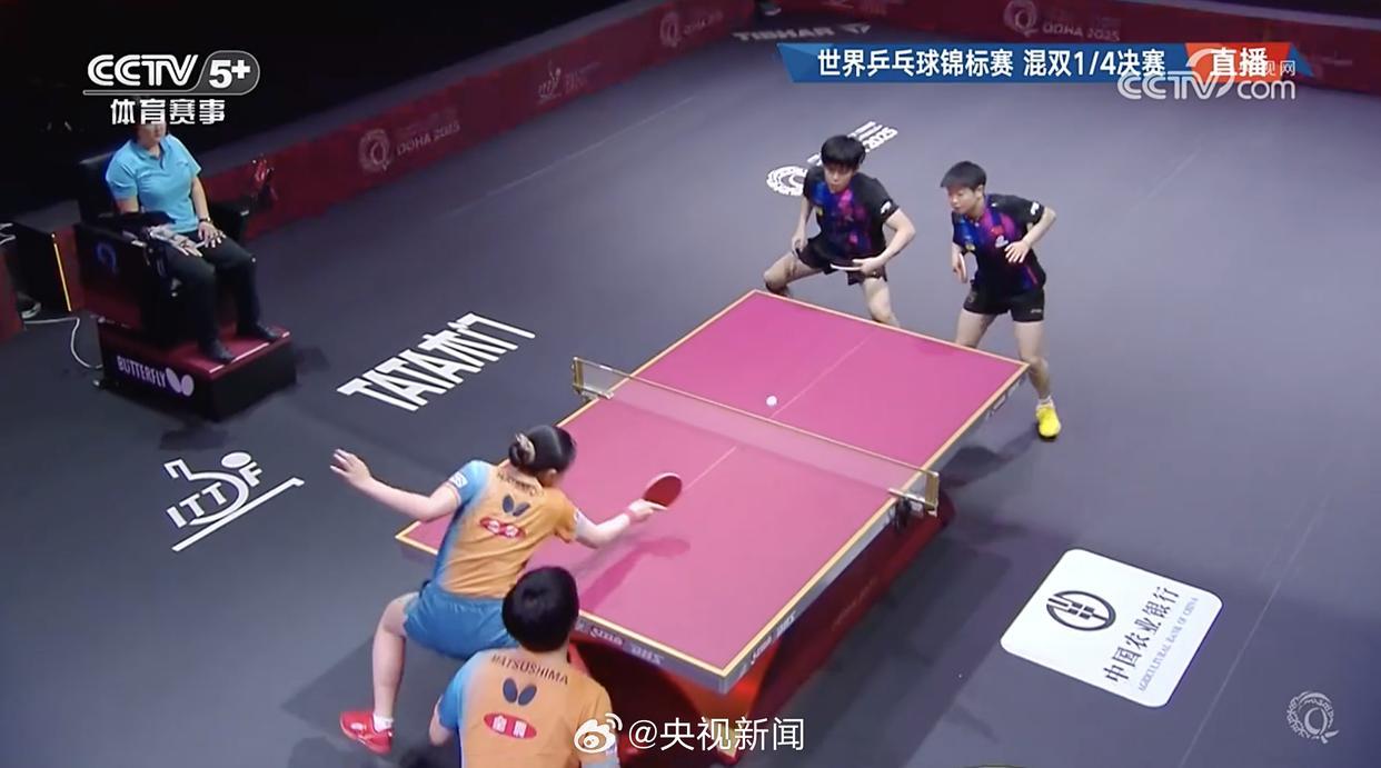 央视消息 2025多哈世乒赛混双1/4决赛,王楚钦/孙颖莎在先失一局的情况下,3-1逆转松岛辉空/张本美和,晋级四强。