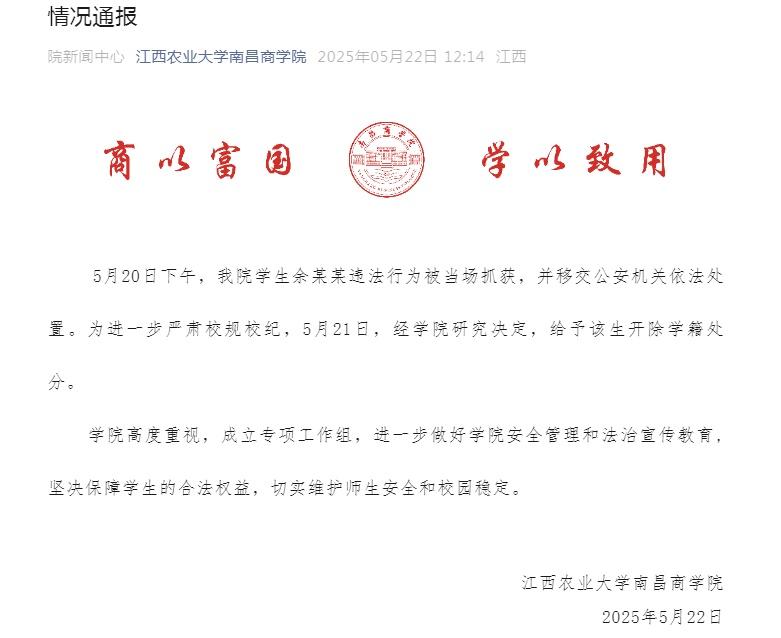 5月22日,江西农业大学南昌商学院发布情况通报称: