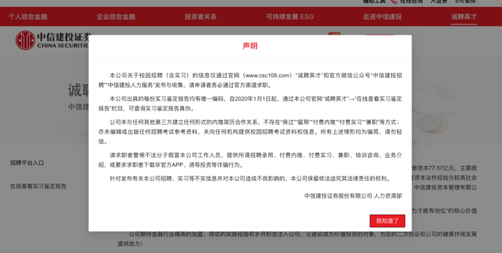 除了字节跳动外,上述实习计划中涉及到的中信建投证券27日在官网发布声明称,公司未与任何其他第三方建立任何形式的内推简历合作关系,不存在“保过”“留用”“付费内推”“付费实习”“兼职”等方式;亦未编辑或出版任何招聘考试参考资料,未向任何机构提供校园招聘考试资料和信息。所有上述情形均为骗局,请勿轻信。