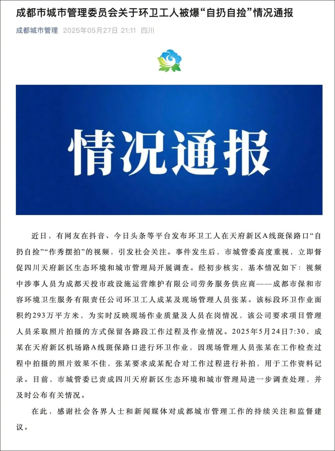 5月27日,成都市城市管理委员会发布关于环卫工人被爆“自扔自捡”情况通报。