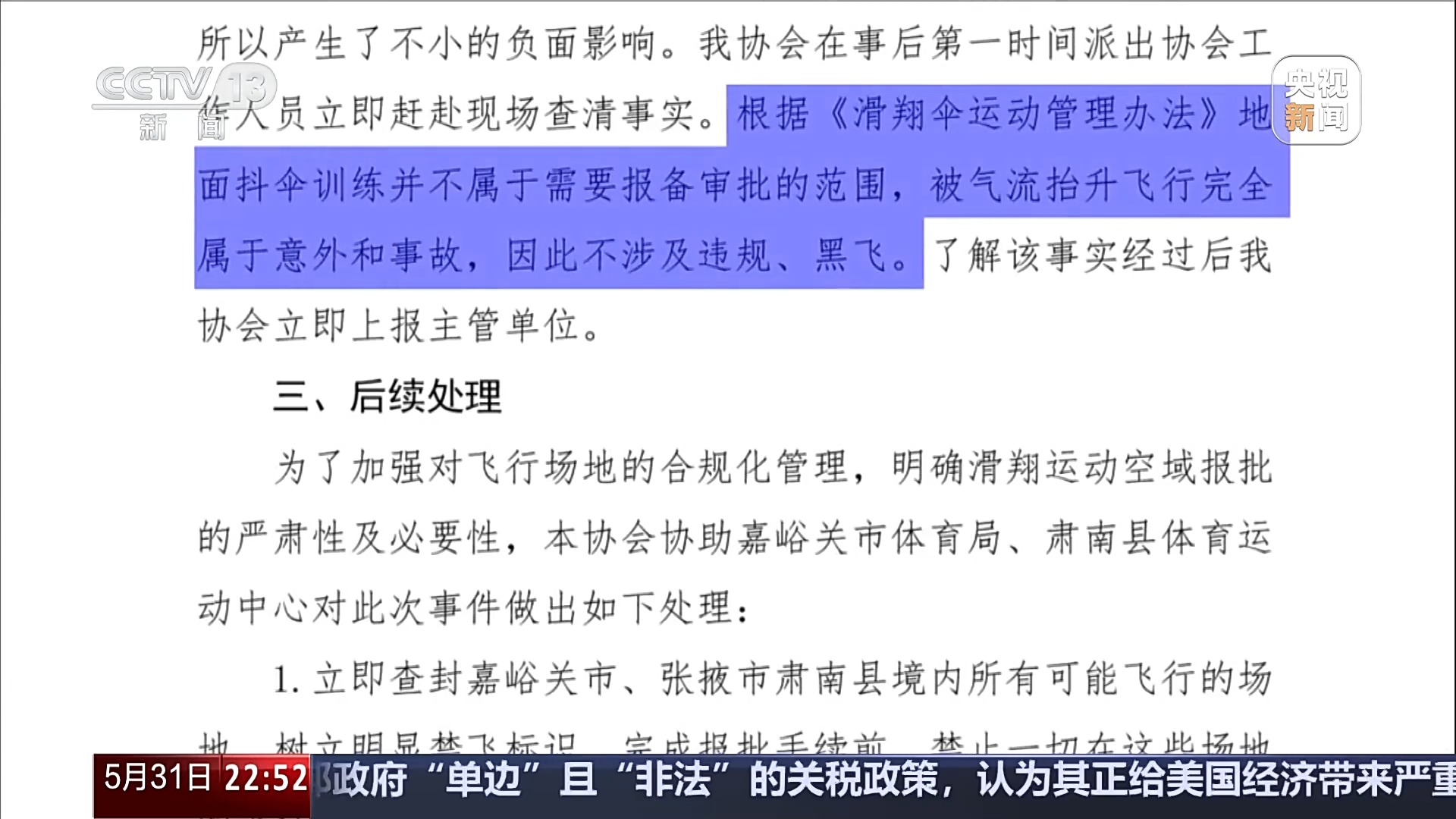 此外,报告还认定:根据《滑翔伞运动管理办法》,地面抖伞训练并不属于需要报备审批的范围,被气流抬升飞行完全属于意外和事故,因此彭玉江不涉及违规、黑飞。但是他也因此事故受到了停飞六个月,写好事故反思报告,深刻总结本次飞行事故的处罚。