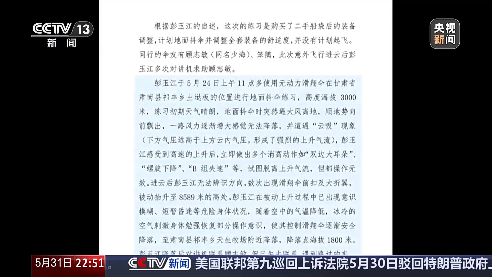 彭玉江形容,这趟意外的飞行,就像是从鬼门关走了一遭。5月28日本周三,甘肃省航空运动协会发布报告:彭玉江是在地面抖伞时突然遇大风离地无法降落,并遭遇“云吸”现象。虽然不是彭玉江有意起飞,但记录仪显示,气流将他从海拔3000多米的地面,一路推向了8589米的高空。航空运动专家介绍,这个高度,已经处在民航客机平流层的巡航高度区间。