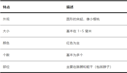 红痣其实比较好判断,基本的特点就是圆形的小颗粒,大多在1毫米到5毫米之间。由于是血管的增生,它一般是红色的,偶尔会有紫色的,个别时候带点蓝色。正因如此,它还有另一个名字,叫作“樱桃状血管瘤”。