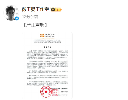 彭于晏工作室经由慎重考虑,现已正式委托北京市中伦(上海)律师事务所开展调查取证工作,并启动维权诉讼程序,本所特此声明:
