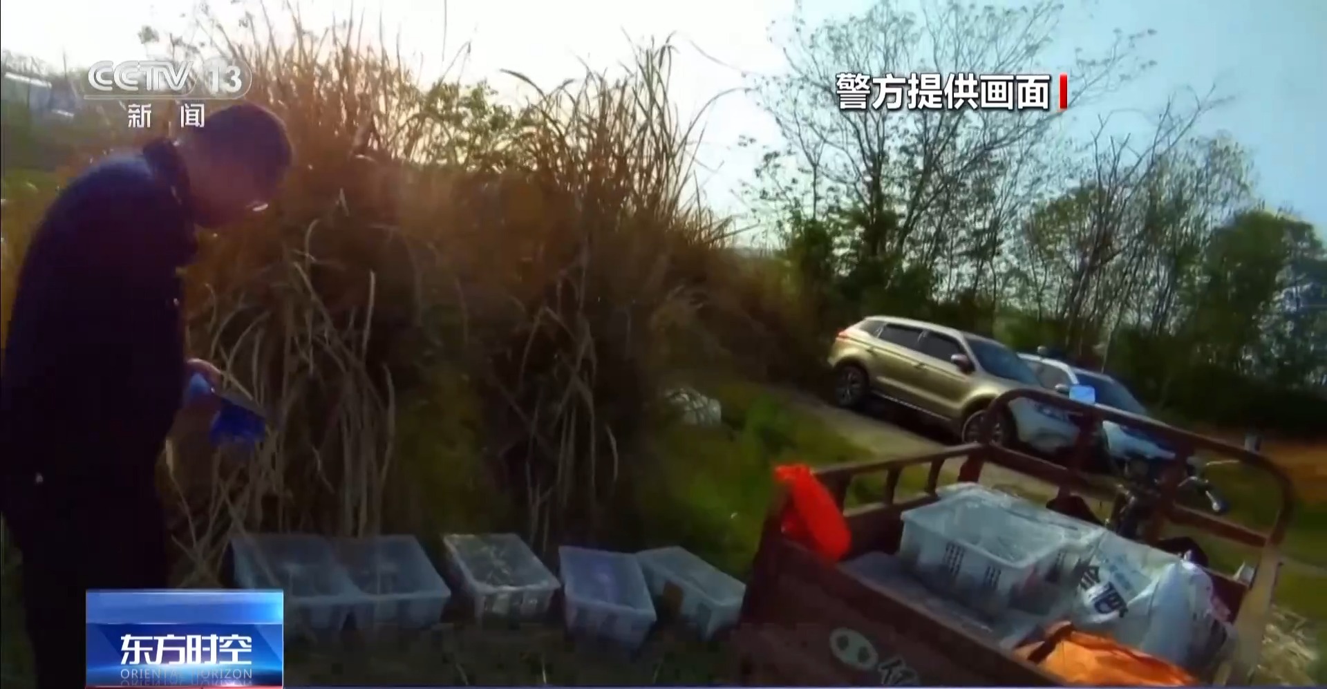浠水县公安局汪岗派出所副所长 邱实:我们在车辆附近进一步扩大搜寻范围,大概几百米外一个地方又发现了五筐,同样是大白鹭幼鸟。