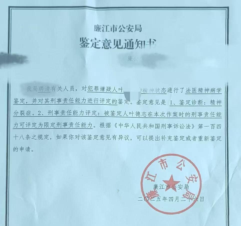 根据被害人家属提供的廉江市公安局鉴定意见通知书照片显示,鉴定意见为:一是鉴定诊断为精神分裂症;二是被鉴定人叶某某在本次作案时的刑事责任能力可评定为限定刑事责任能力。