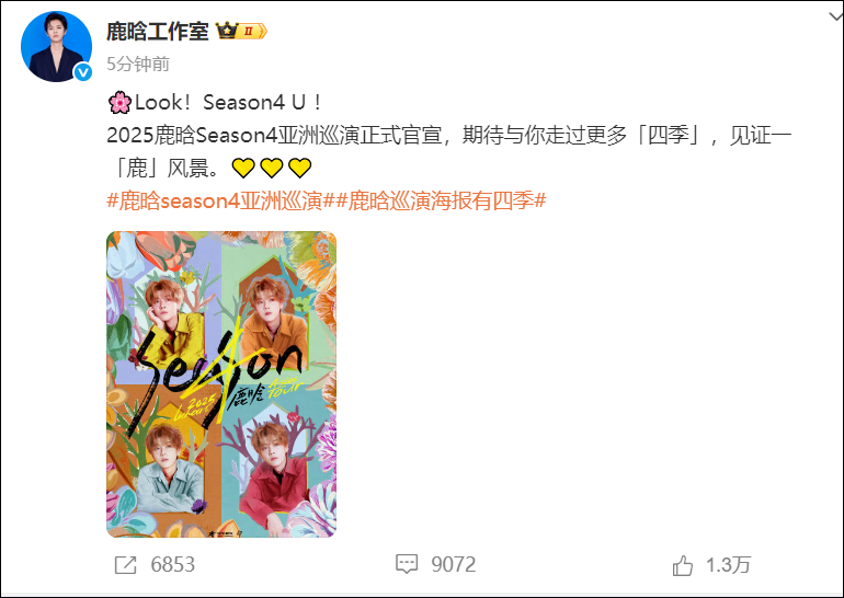 据此前报道,5月23日,@鹿晗工作室 官宣2025鹿晗Season4亚洲巡演,暂未宣布时间地点。