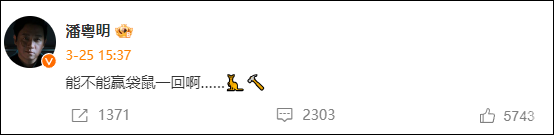 就在3月25日下午,国足对阵澳大利亚比赛之前,潘粤明就发文:“能不能赢袋鼠一回啊……”