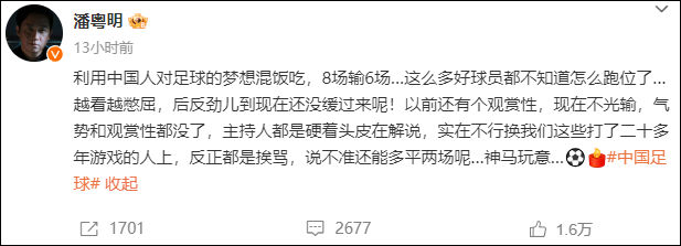 3月26日晚,潘粤明发文谈“国足8场6败”,引发网友热议,相关话题词冲上热搜榜。