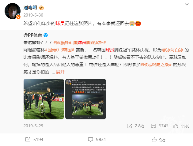 此外,2019年5月29日晚,“熊猫杯”国际青年足球锦标赛在成都收官,韩国U18国家队获得冠军。然而,就在颁奖仪式后,出现了令人气愤的一幕:绿茵场上,一名韩国球员脚踩“熊猫奖杯”,单手叉腰。照片一出,全网都感到震惊和愤怒。