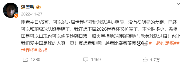 2022年11月27日晚,潘粤明发文聊世界杯观后感,他写道:“刚看完日VS哥,可以说这届世界杯亚洲球队进步明显,没有很明显的差距,已经可以和顶级球队掰手腕了。”