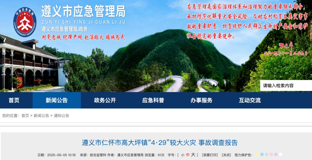 6月5日,贵州遵义市应急管理局公布遵义市仁怀市高大坪镇“4·29”较大火灾事故调查报告。
