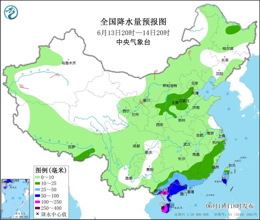 6月13日20时至14日20时,广西东部和南部沿海、广东中西部和东南部沿海、海南岛、台湾岛大部等地部分地区有大到暴雨,其中,广西东南部沿海、广东西南部、海南岛中西部等地部分地区有大暴雨,海南岛西部等地局地特大暴雨(250~270毫米)。内蒙古中西部、宁夏中部、新疆南疆盆地、华南沿海等地部分地区有4~6级风,广西东南部沿海、广东西南部等地部分地区有6~7级风。东海大部海域、台湾以东洋面、南海大部海域将有5~7级、阵风8级大风,其中,南海西北部海域、北部湾、琼州海峡将有7~9级、阵风10级(见图5)。