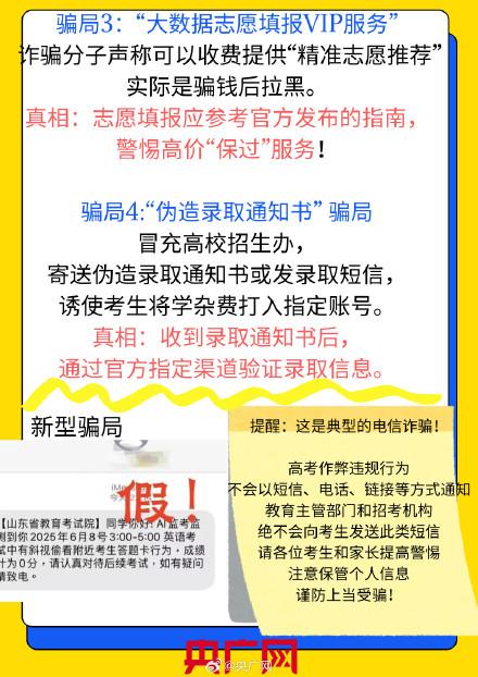 央广网讯 高考过后,这些重要信息谨慎晒!高考结束了,但不法分子精心设计的“陷阱”正悄然布下——骗子紧盯考生和家长对录取信息、升学途径的迫切关注,以“内部指标”“助学金申请”等虚假名目为诱饵,企图将欺诈的黑手伸向满怀期待的家庭。