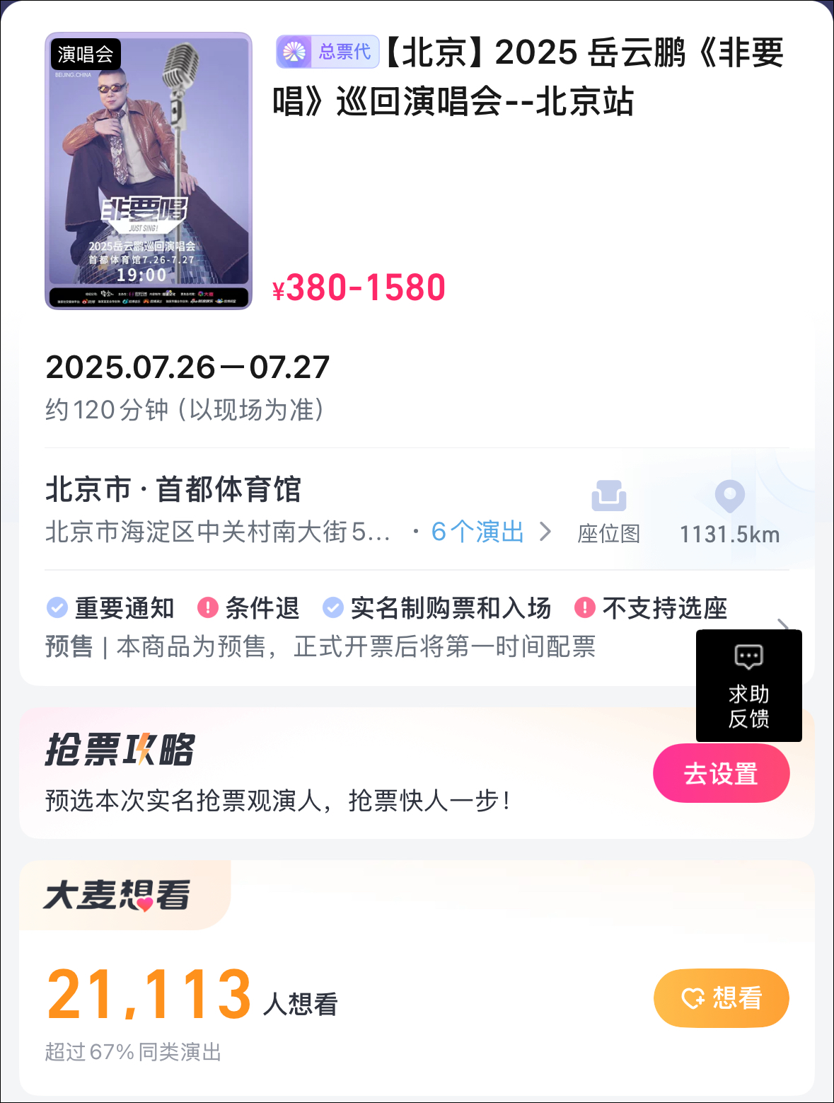 据悉,该巡回演唱会首站北京站门票于今天10点18分开抢,最高票档1580元。据购票平台显示,该演唱会有超2万人登记“想看”。