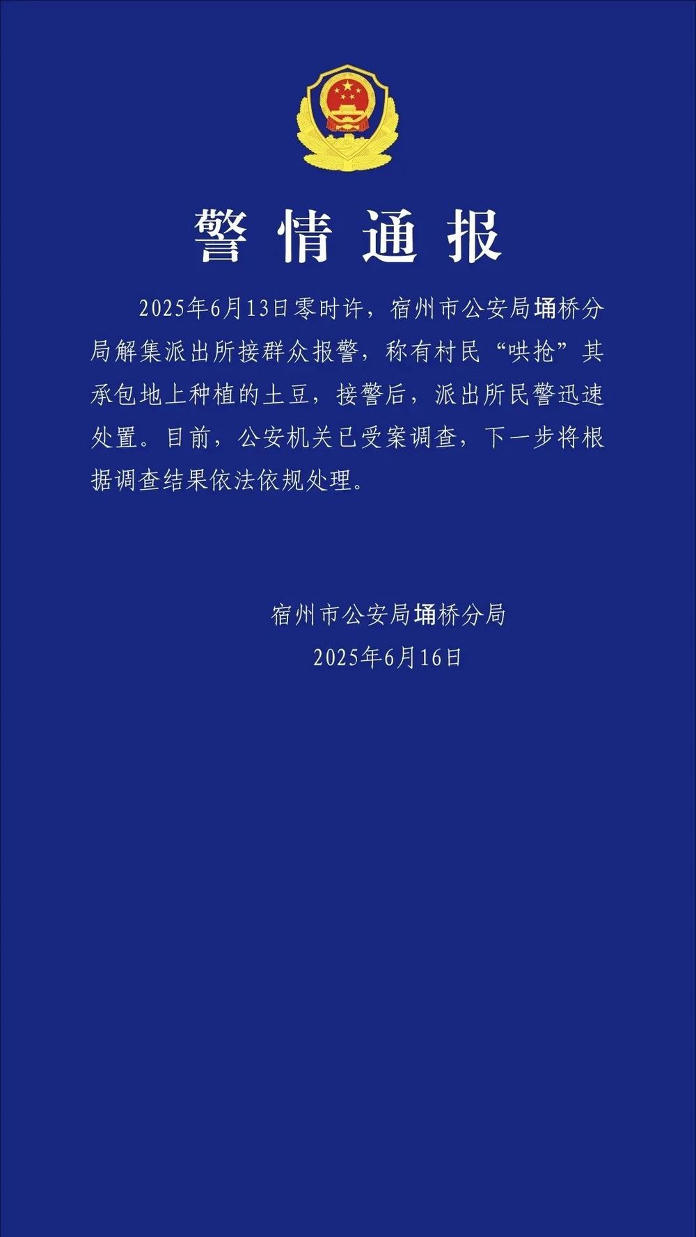 据媒体此前报道,安徽宿州一种植户反映称,他在当地承包了500亩地种土豆,收获时却遭到大批村民哄抢。6月16日晚,安徽省宿州市公安局埇桥分局发布警情通报。通报称,目前,公安机关已受案调查,下一步将根据调查结果依法依规处理。