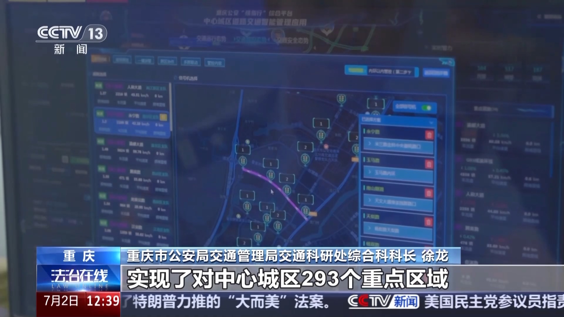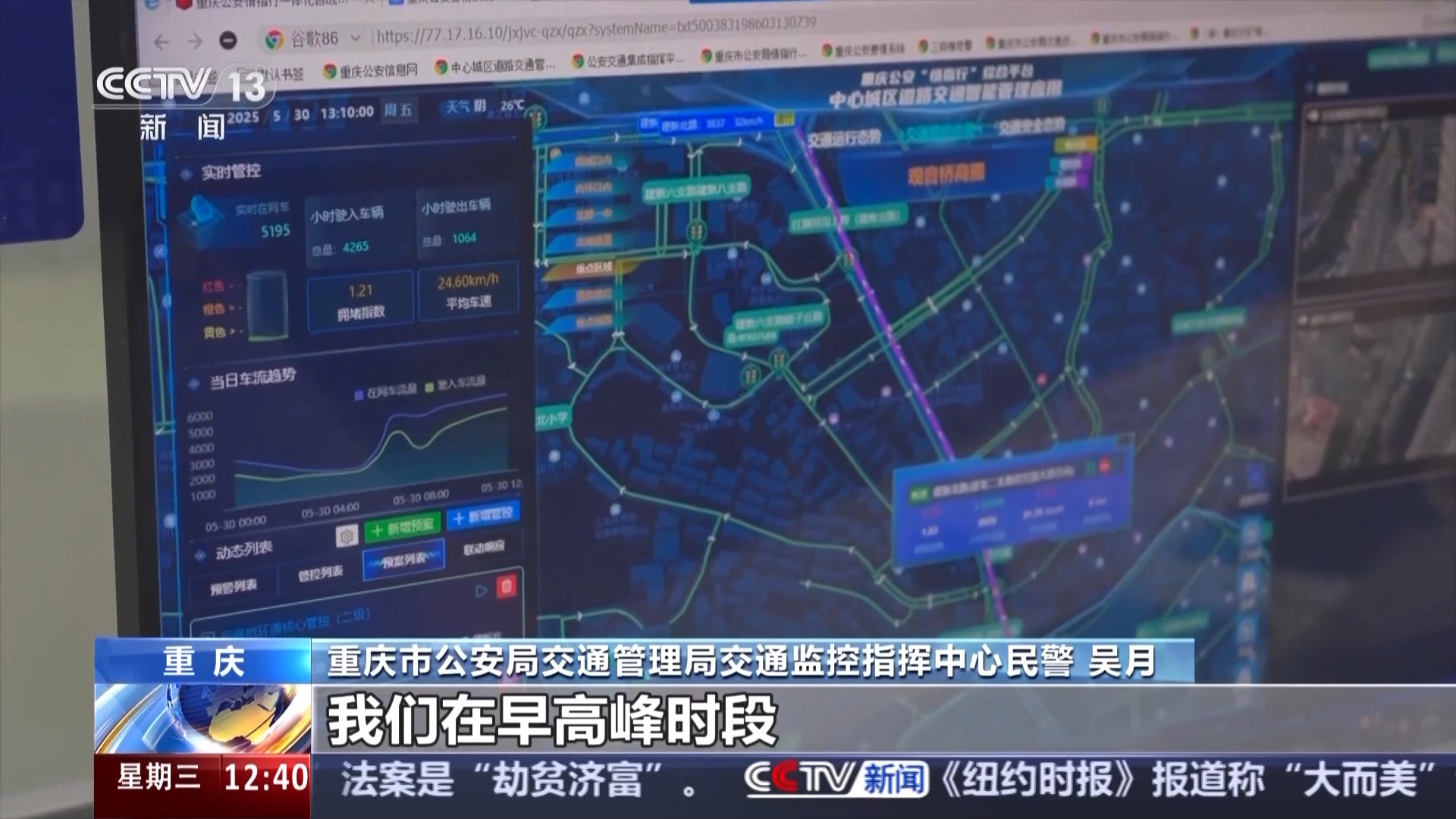 重庆市公安局交通管理局交通科研处综合科科长 徐龙:这里整合了公安、交通、气象等14个部门140类200亿条数据,集成90多个AI模型,实现对中心城区293个重点区域、273条关键道路的智能管理。