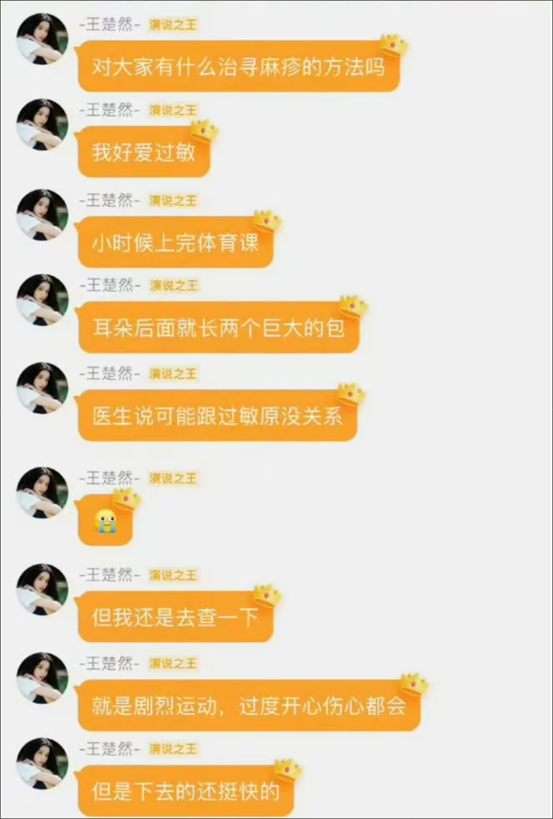 王楚然提到剧烈运动后,或者过度情绪激动,就会起红疹。