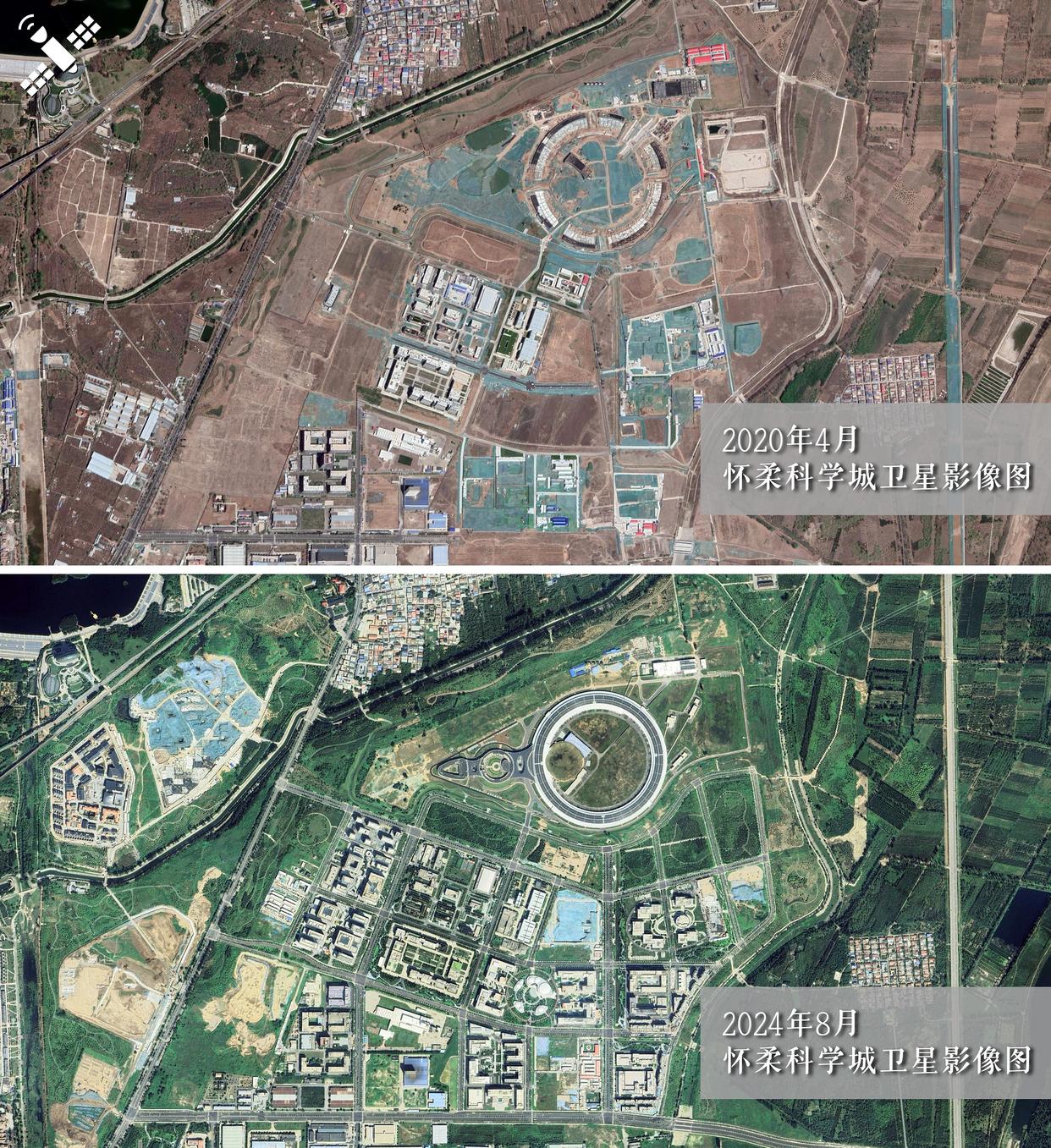 解读:2020年4月规划区(上图)与2024年8月建成区对比(下图),怀柔科学城大科学装置布局初现。