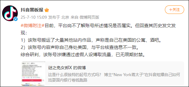 7月10日下午,抖音黑板报发布通报: