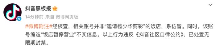 当晚,@抖音黑板报 发文:“经核查,相关账号并非“邀请杨少华剪彩”的饭店,系仿冒。同时,该账号编造“饭店暂停营业”不实信息。以上行为违反《抖音社区自律公约》,已处置无限期封禁。”