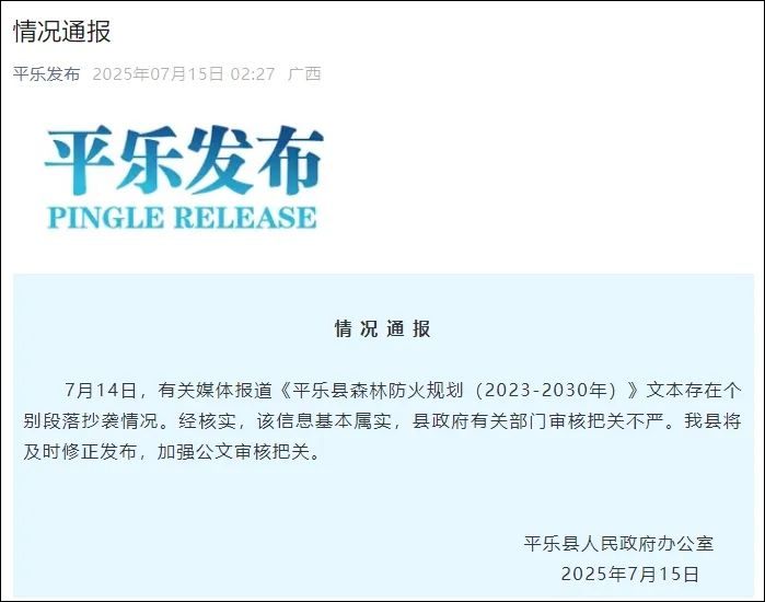 7月14日,有关媒体报道《平乐县森林防火规划(2023-2030年)》文本存在个别段落抄袭情况。经核实,该信息基本属实,县政府有关部门审核把关不严。该县将及时修正发布,加强公文审核把关。