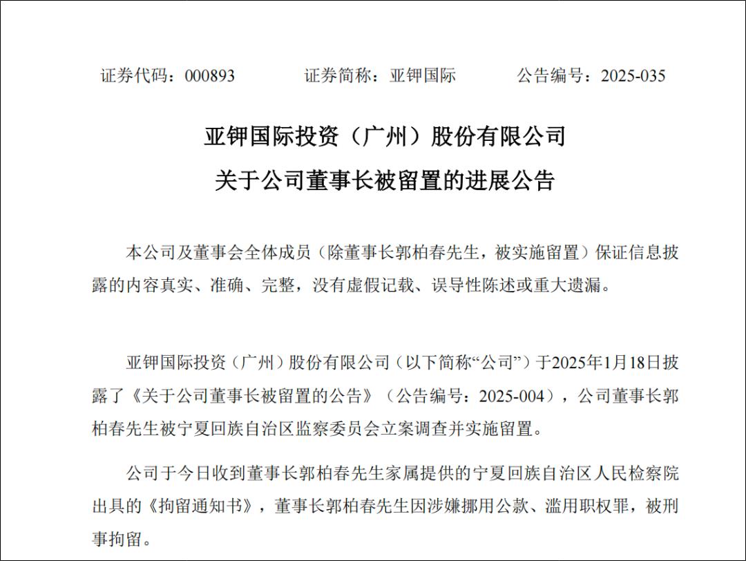 公告称,亚钾国际于18日收到董事长郭柏春家属提供的宁夏回族自治区人民检察院出具的《拘留通知书》,郭柏春因涉嫌挪用公款、滥用职权罪,被刑事拘留。