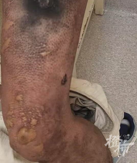 他的左大腿被烧得焦黑,且膝盖处布满水泡。