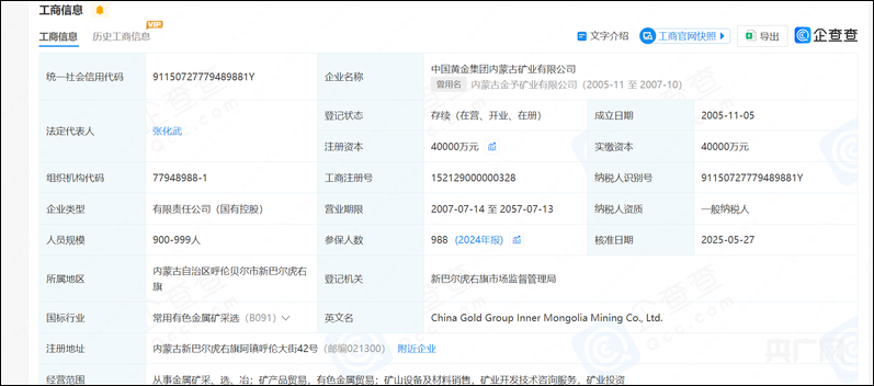中金内蒙古矿业企业信息(央广网发 图源企查查)