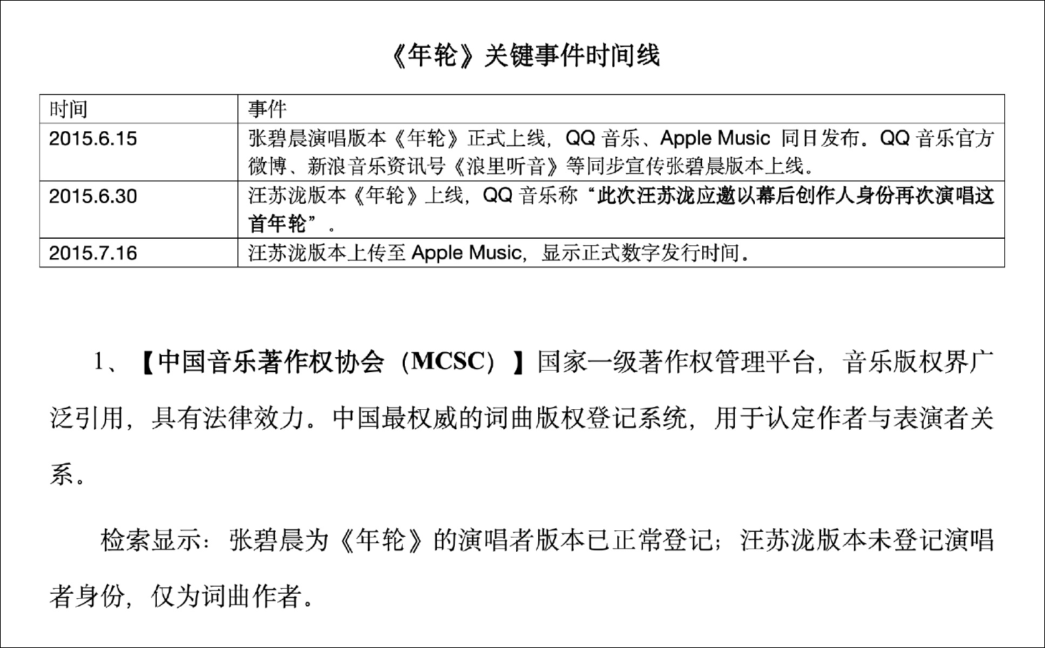 声明中强调2015年6月15日,《年轮》作为电视剧《花千骨》插曲率先上线,由张碧晨女士演唱,为该歌曲最早正式发布的录音版本,亦是《花千骨》电视剧中唯一使用的演唱版本,2015年6月30日,男声版本以单曲形式上架音乐平台,时间上明显晚于张碧晨版本。