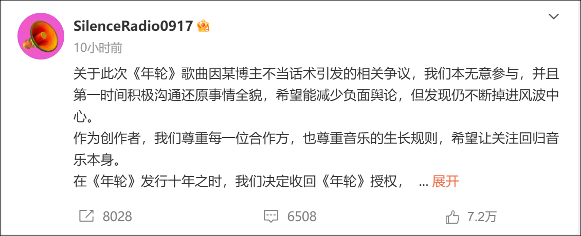 关于此次《年轮》歌曲因某博主不当话术引发的相关争议,我们本无意参与,并且第一时间积极沟通还原事情全貌,希望能减少负面舆论,但发现仍不断掉进风波中心。作为创作者,我们尊重每一位合作方,也尊重音乐的生长规则,希望让关注回归音乐本身。在《年轮》发行十年之时,我们决定收回《年轮》授权,暂不授权该作品做任何演唱。