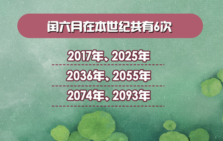 闰六月并不罕见,本世纪这100年里共有6次,分别是2017年、2025年、2036年、2055年、2074年和2093年。