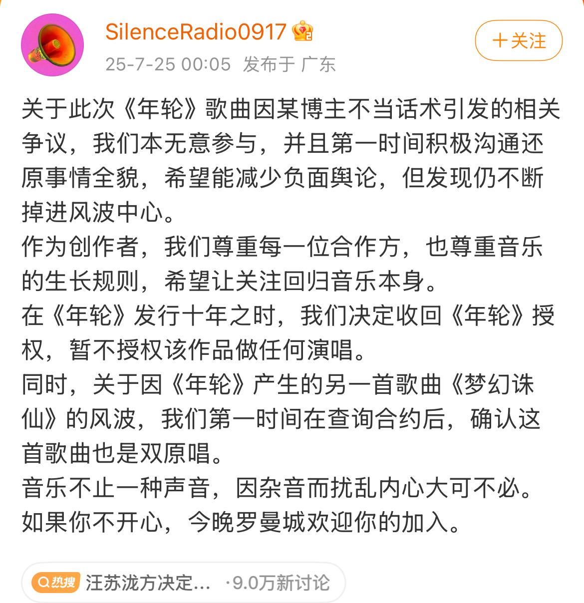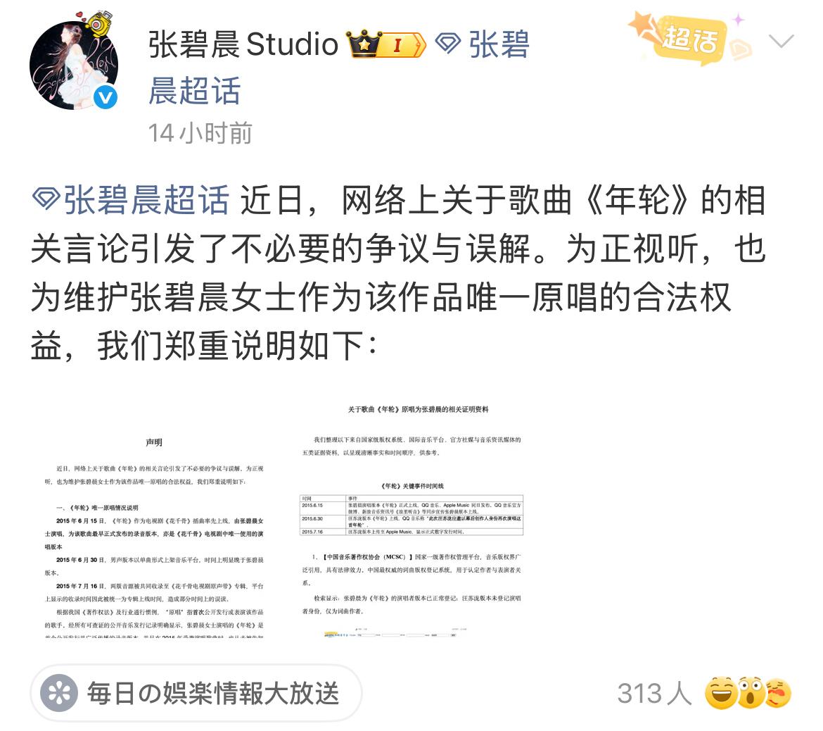 7月25日凌晨的互联网,注定不平静。0点刚过5分钟,汪苏泷工作室发文,宣布收回歌曲《年轮》所有商业演唱授权。15分钟后,张碧晨工作室的声明也来了,坚称张碧晨是“无可争议的唯一原唱”。