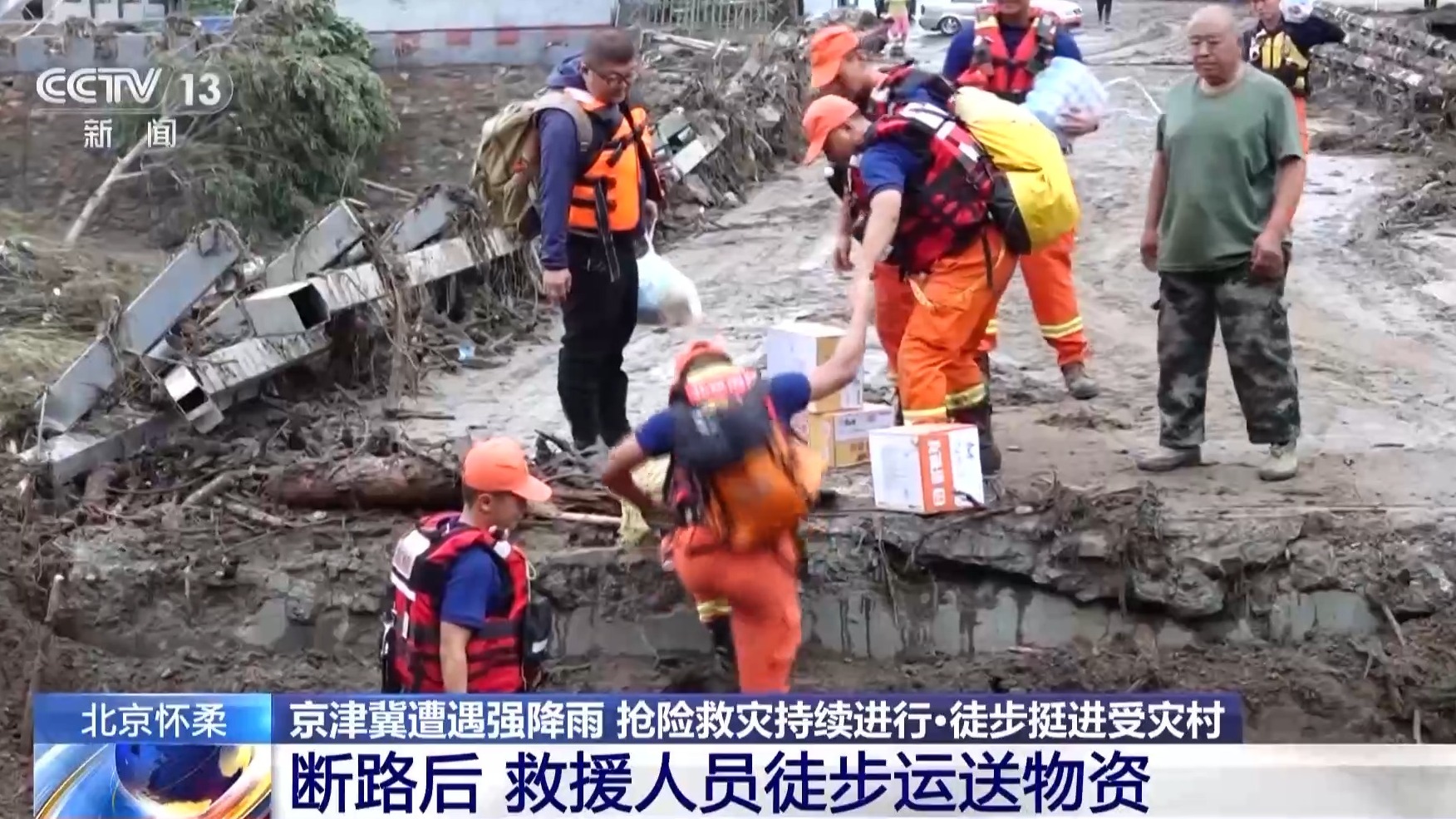记者跟随救援人员从怀柔区琉璃庙镇政府所在地出发,可以看到,道路因为水毁已经中断,救援人员带着物资先徒步进入了最近的老公营村。遇到水毁桥梁,救援人员只能手脚并用翻越通过。
