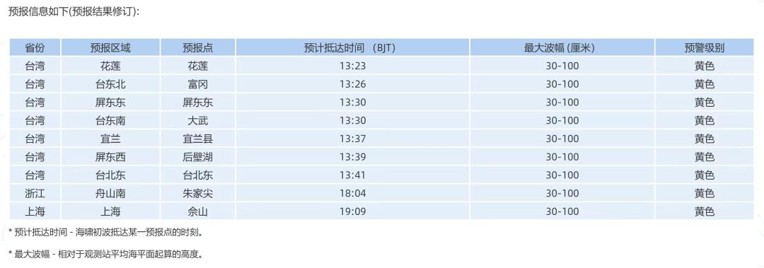 经自然资源部海啸预警中心综合分析研判,此次地震已引发越洋海啸,预计海啸波将于13:30到达台湾沿岸,17-19点左右到达浙江、上海沿岸,最大波幅分别为60、40和30厘米。